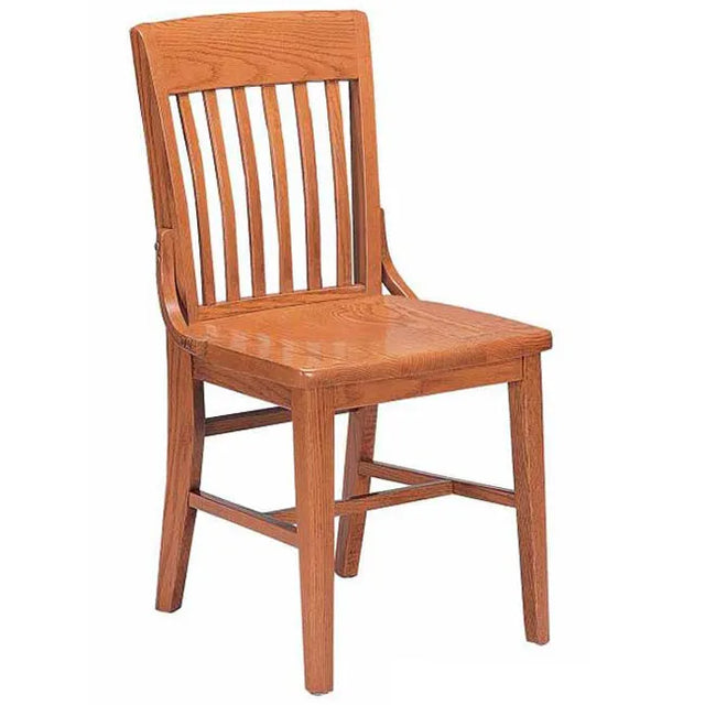 Crafted for comfort and durability, this chair features a 1" thick saddled seat with a rounded front edge. The steam-bent top and lower cross backs are double-doweled for added stability. Vertical slats are precision-fit into the cross backs for ergonomic support. Tapered front legs and steam-bent back legs ensure a sturdy foundation, reinforced with H-style stretchers and additional braces. Rounded corners and edges, along with glued and screwed corner blocks, provide long-lasting strength and a polished finish. Perfect for both function and style.