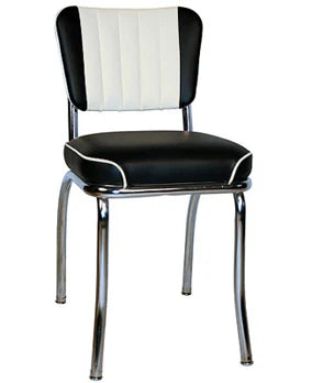 Two tone diner chair backrest is reminiscent of classic 1950's and 1960's automobile interiors. Perfect for the 50's soda fountain, 50's kitchen, Moderne "Kitchy" kitchen or diner restaurant.