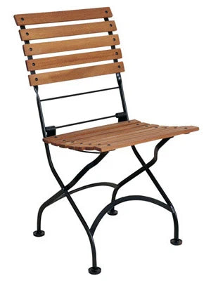 Durable, European made steel French bistro style folding chairs are faithful reproductions of the 19th Century original French street bistro/cafe chair design with modern improvements. Extra wide five back slats and seven seat slats. French bistro folding chairs are attractive enough to use inside for permanent dining room installations. Durable for use outside with drawn steel frames treated for rust resistance and powder coated.