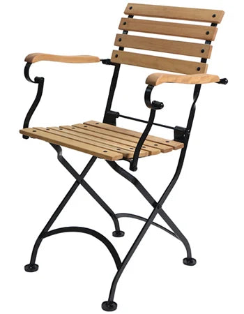 Durable, European made steel and teak French bistro style folding armchairs are faithful reproductions of the 19th Century original French street bistro/cafe chair design with modern improvements. French bistro folding armchairs are attractive enough to use inside for permanent dining room installations. Durable for use outside with drawn steel frames treated for rust resistance and powder coated.
