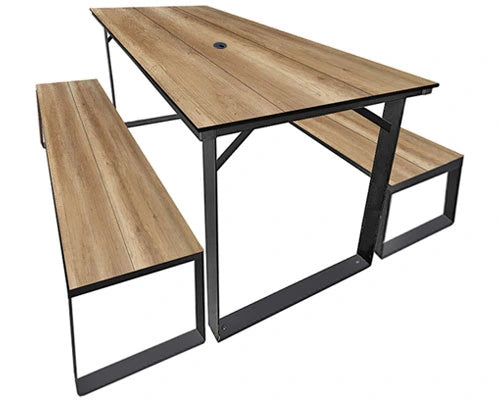 Table Tops and Seats are a 12mm thick ( 15/32 inch - almost 1/2 inch ) solid core HPL product comprised of thin layers of kraft paper saturated with phenolic resin then pressed under high temperature & pressure which provide extreme durability for exterior use.